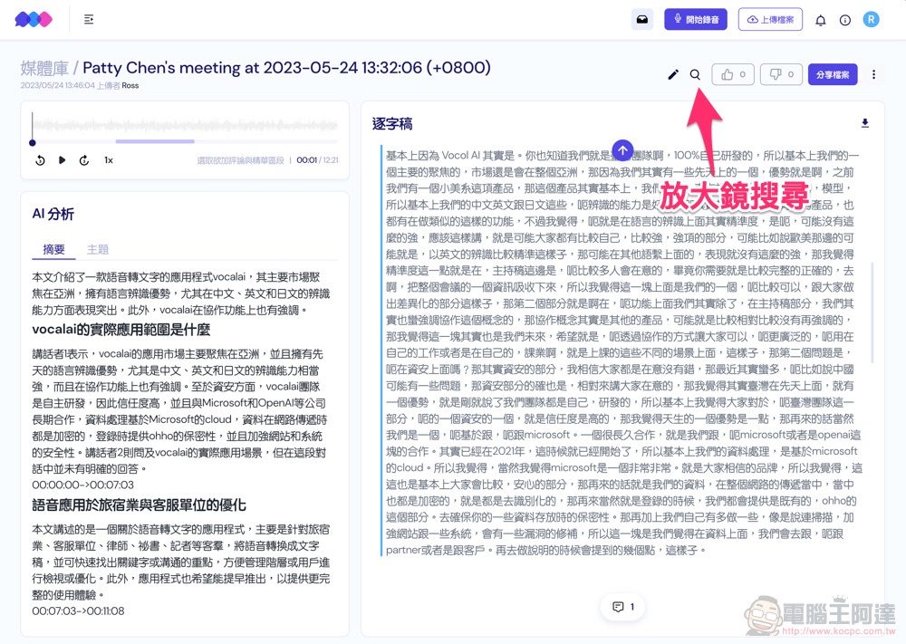 針對採訪的內容,不僅可以來回快速進行回放聆聽。更能以放大鏡來進行關鍵字的搜尋: