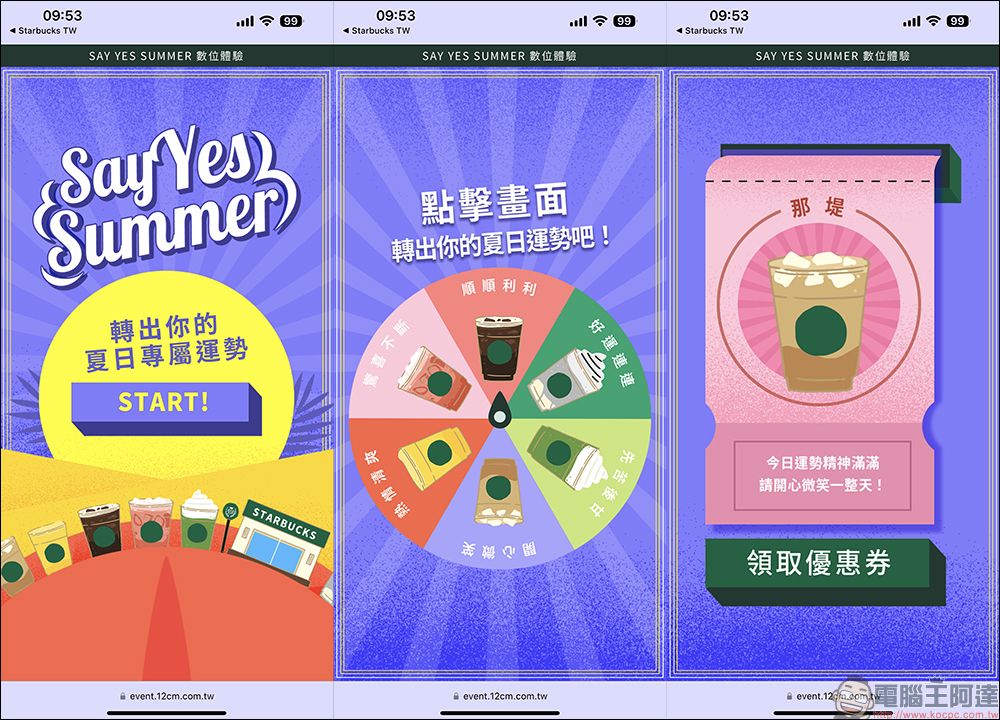 在「SAY YES SUMMER!夏日數位體驗」活動頁的遊戲轉出夏日專屬運勢,接著點選「領取優惠券」: