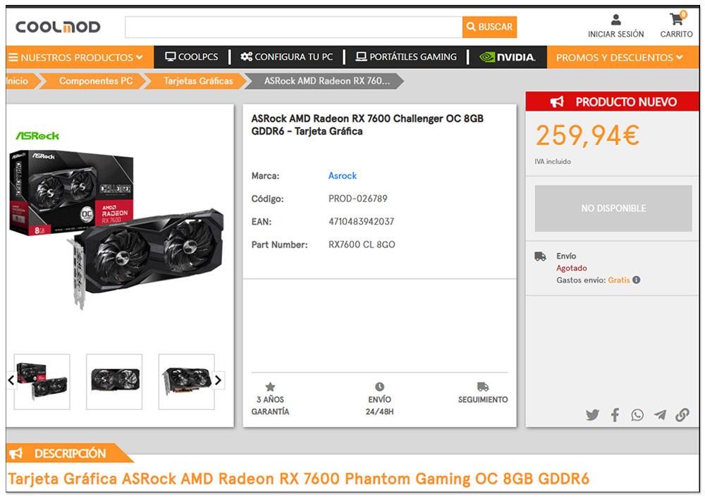 根據外媒 VideoCardz 報導,歐洲的 AMD Radeon RX 7600 MSRP 建議售價是 299 歐元,大約台幣 9,840 元,而昨天開賣之後,不知道是賣不好還是其他原因,現在西班牙還蠻大間的 CoolMod 線上購物網站很快就把 ASRock RX 7600 Challenger OC 顯卡價格調低至 259.94 歐元,意味著比官方的建議售價還便宜了 40 歐元,大約是台幣 1,300 元,折扣高達 13%,才剛推出的新顯卡,價格就下殺這麼多,可說相當罕見。