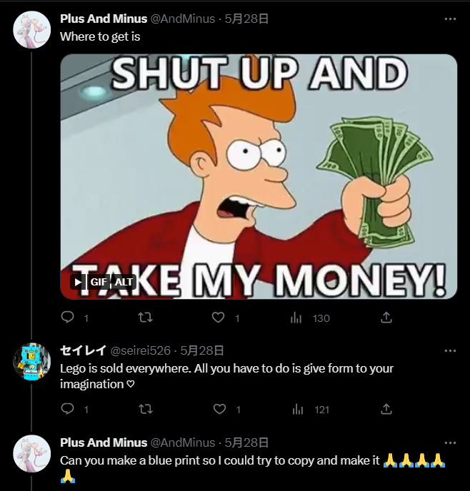 成品在推特圈引起了不小的迴響,有網友直接貼出著名梗圖「Shut up And Take My Money」想直接擁有一尊,或是請求作者釋出風靈鋼彈設計藍圖,好讓玩家們自行蒐集材料自己拼裝。不過都被作者婉拒。至於藍圖,他甚至說自己並未撰寫這類文件來規劃自己的作品。想來這尊風靈鋼彈多少經過了長時間的構思與尋找料件,才能拼出這麼一具。