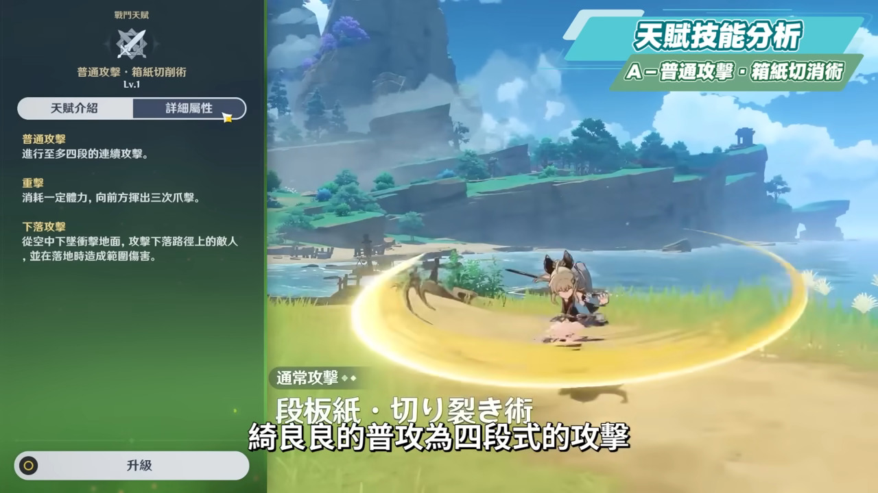 綺良良的普攻為四段式的攻擊,最後兩下會有貓爪向前抓,不過因為普攻並沒有元素轉化,所以玩法上主要以盾輔為主,又或是選擇大招爆發流,所以普攻可升可不升。
