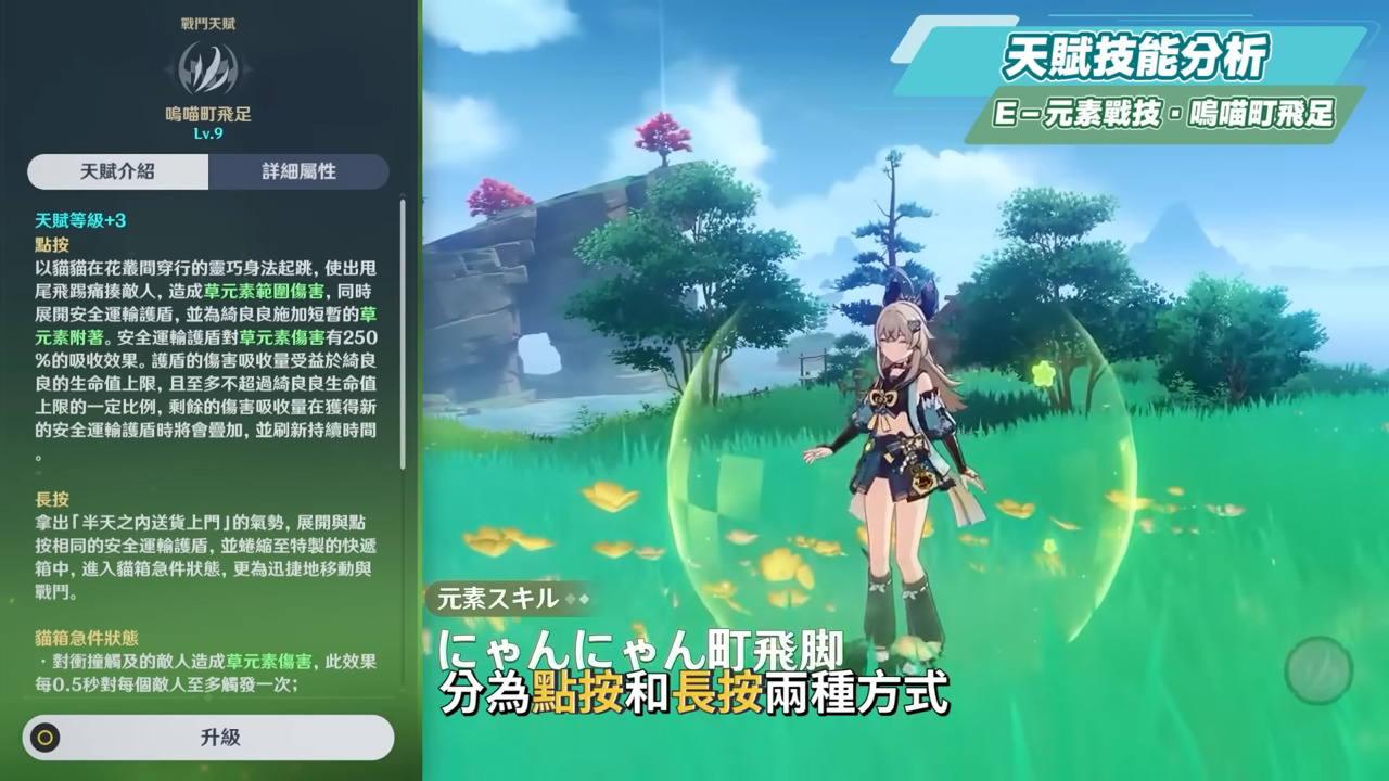 而長按時則會進入「貓箱急件」狀態,衝撞敵人時會對敵人造成弱草元素附著,命中敵人會產生1顆草元素微粒,冷卻時間4秒,因此時長12秒內最多產生3顆草元素微粒,持續時間越長,冷卻時間也會越長,最多12秒,展開護盾的同時,綺良良的移動速度、攀爬速度與跳躍能力都會提升,也是全遊戲中第一個能夠快速爬山的角色,只是體力消耗也會增加,非常適合大世界探索,貓箱狀態若是被凍結要按跳躍鍵解除控制時會取消貓箱狀態,又或是貓箱狀態時再次按下衝刺鍵也會取消狀態、而處於貓箱狀態衝撞敵人時也能對敵人造成草元素傷害,結束貓箱狀態時會使出一個爪擊,造成草元素範圍傷害,搭配固有天賦1的效果,護盾還能進行疊加,並刷新持續時間。