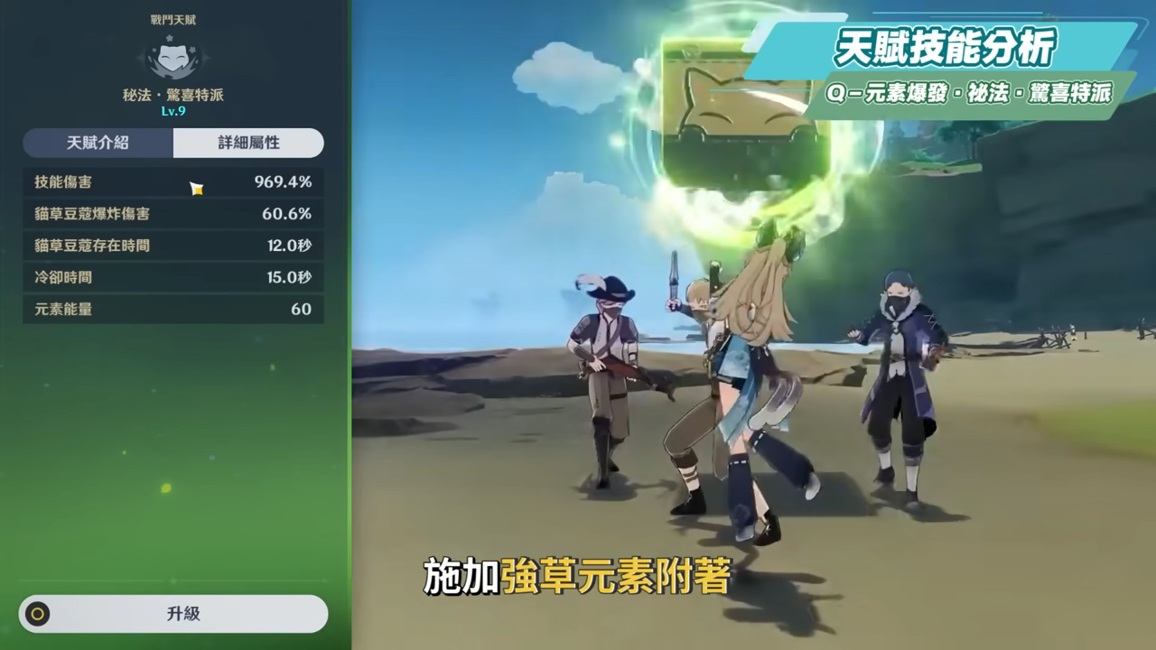 綺良良的核心技能主要在於E元素戰技的護盾效果,透過提升天賦等級可以增加護盾吸收量,以自身定位為盾輔角色的綺良良來說建議優先點高E元素戰技,其次是想體驗大招輸出玩法的話,則可以點高元素爆發,普攻基本上不太會使用到,因此可升可不升。
