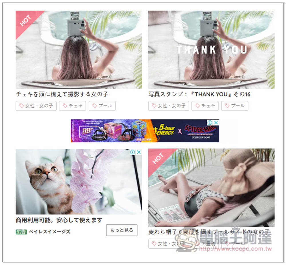 不過這網站的廣告有一點多,而且是混在素材牆裡面,左上角有標示 PR 的就是廣告,點擊會連結到 iStock 素材網站,所以要注意,而有標註 HOT 則是熱門素材:
