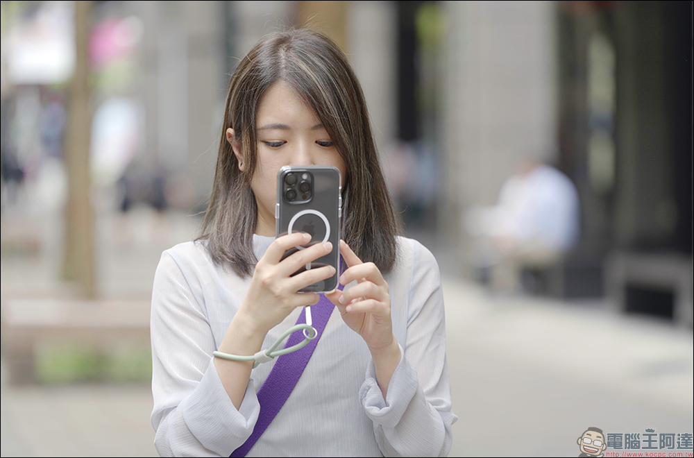 筆者推薦各位在調整背帶長度時,可以調到手舉起來剛好的高度,如此一來長時間拿著手機也不會太費力。