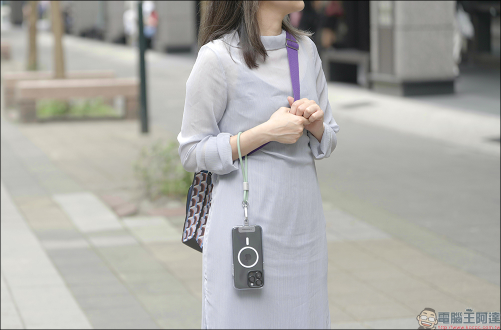 當出門身上的小包包放不下手機,同時穿搭服飾沒有口袋時,也可將它懸掛在手腕上。