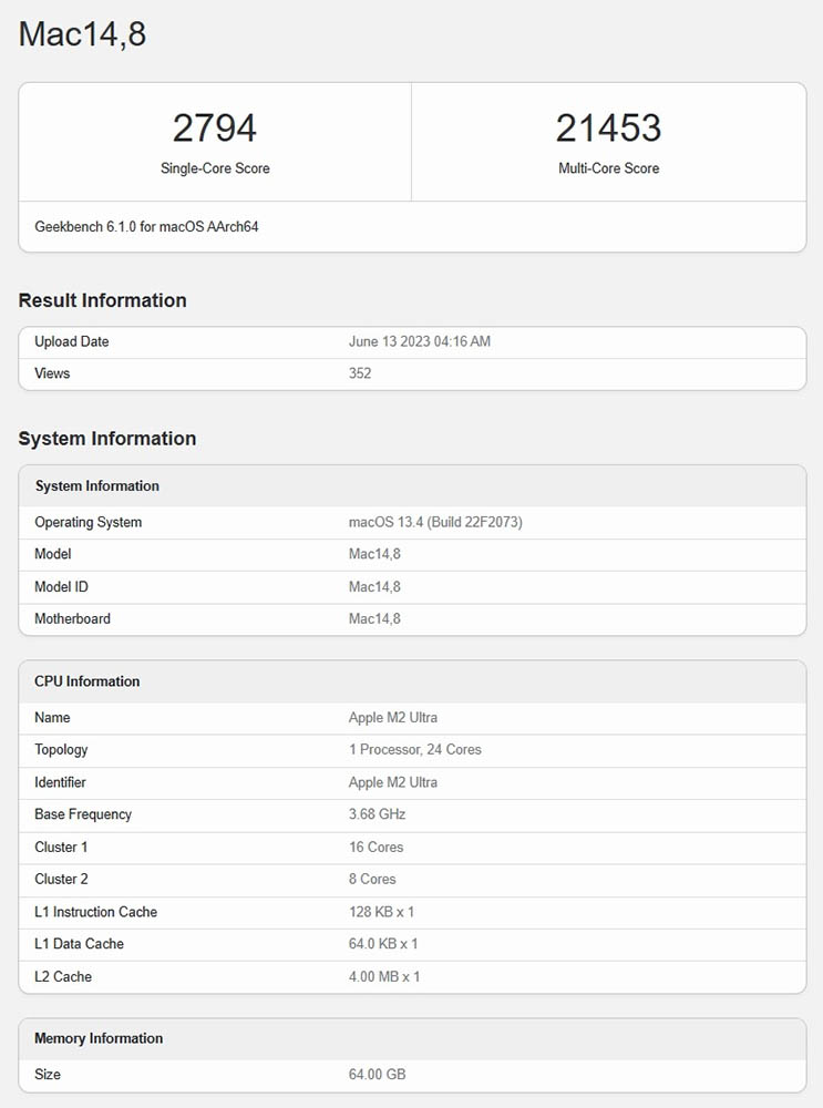近日在 Geekbench 6 資料庫中,出現一筆 Mac14,8 的成績,搭載 Apple M2 Ultra 晶片,擁有 24 核心。雖然沒有寫是 Mac Pro,不過根據外媒確認,配備 M2 Ultra 的 Mac Studio 都會統一標示成 Mac14,14,而 Mac Pro 是 M14,8,所以這筆就是新款 Mac Pro 的成績。