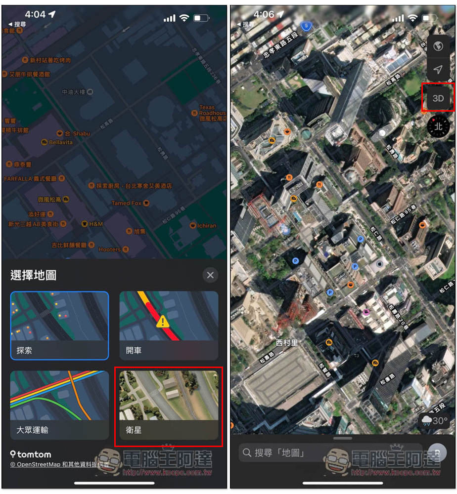 第二個方法是將地圖先切換成衛星顯示模式,右邊就會看到 3D 功能,點一下即可切換成 3D 顯示模式: