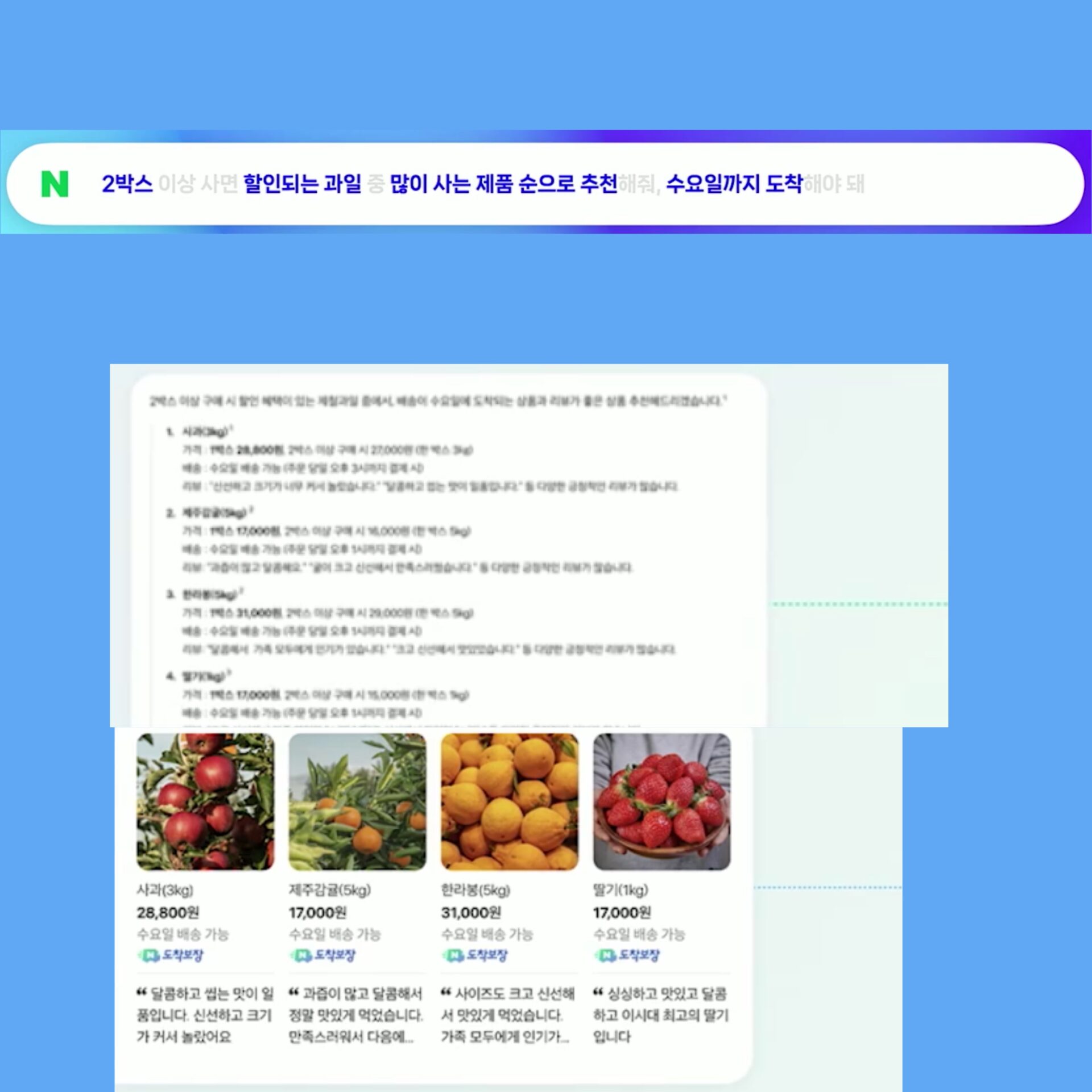 或者是搜尋「如果購買兩箱以上的水果中,可以打折的水果裡賣得最好的產品以排序的方式推薦給我,需要在禮拜三之前抵達」,cue: 通過“兩箱”、“可以打折的水果”、“賣得最好的商品以推薦的方式”、“在禮拜三之前到達”四個關鍵字,排列出賣的最好的水果商家,並在下方附上商家們的網址。