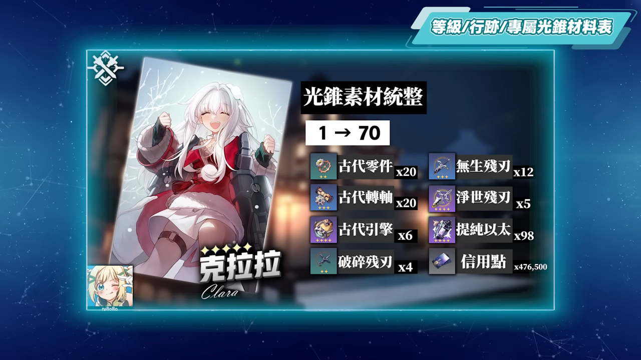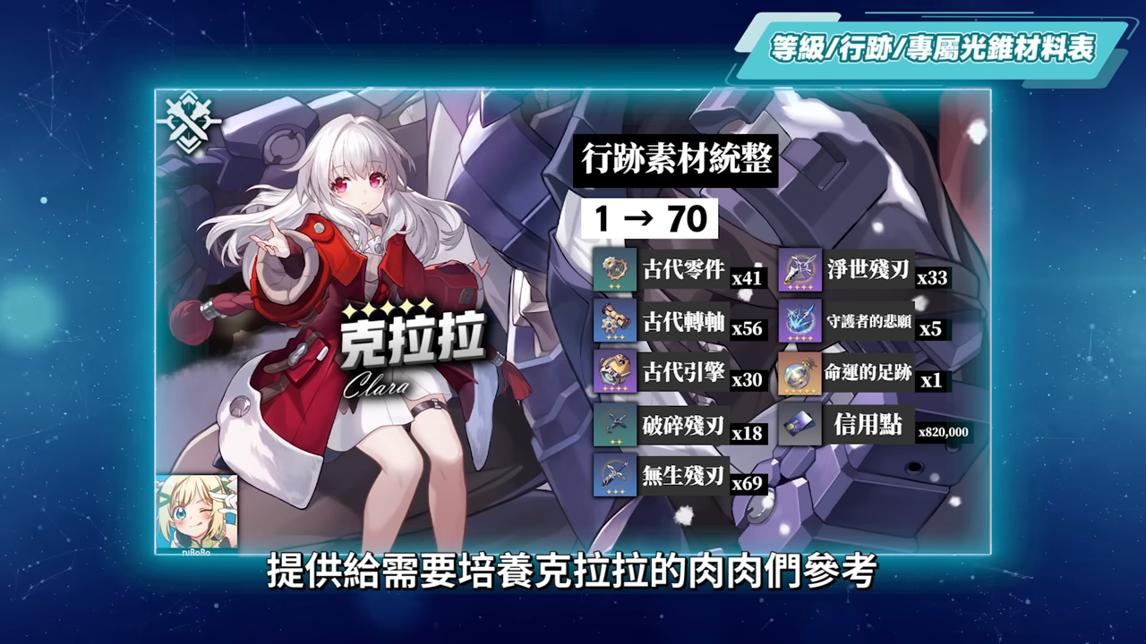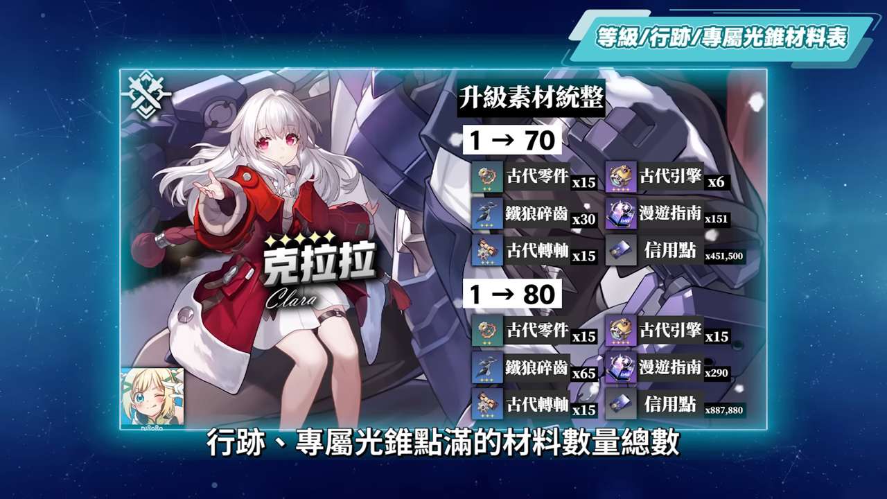 這裡也附上克拉拉1~70等、1~80等、行跡、專屬光錐點滿的材料數量總數,提供給需要培養克拉拉的肉肉們準備,有需要的話也可以再自行截圖保存。![【星穹鐵道】🚀克拉拉[培養全攻略]▸反擊流的關鍵核心角色?光錐/遺器/行跡/星魂效果推薦!是否綁定三月七?反擊、物理、追擊組隊配置! ▹璐洛洛◃ - 電腦王阿達 【星穹鐵道】🚀克拉拉[培養全攻略]▸反擊流的關鍵核心角色?光錐/遺器/行跡/星魂效果推薦!是否綁定三月七?反擊、物理、追擊組隊配置! ▹璐洛洛◃ - 電腦王阿達](https://www.gbyhn.com.tw/wp-content/uploads/2023/06/1687375719-5037006b021449c644c68822ce88586c.png)