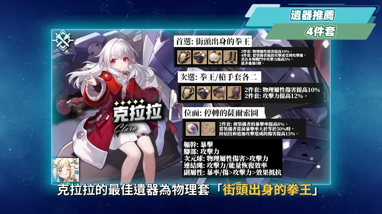 克拉拉的最佳遺器為物理套「街頭出身的拳王」,拳王套前期可以到雅利洛6號下城區的商人中購買到紫色物理套「拳王套」,二件套為物理傷害提高,四件套為裝備者釋放攻擊或受到攻擊後,其在本場戰鬥中攻擊力提高5%,最多疊加5層,整體效果是非常適合克拉拉的。若是還沒有拳王4件套也可以先用快槍手+拳王套2+2的配置來過渡用。
