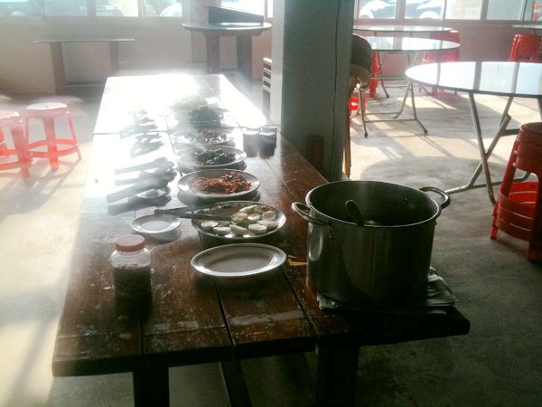 另外炒了一大盤的鹹豬肉,讚耶…大家也許會奇怪為什麼要圍一圈礦泉水,原因是那裡蒼蠅真的是世界第一無敵多呀!!光看右上方就一張補蠅紙,那還是已經被圍到抓狂才跟老闆要的,接下來的畫面請大家要有心理準備…..