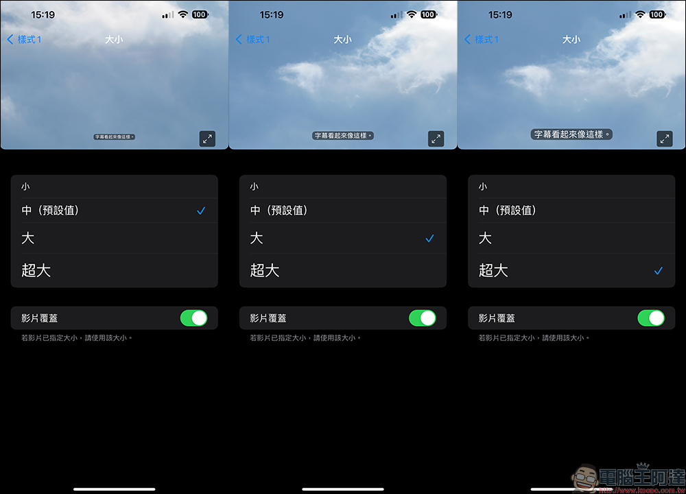 字幕的文字部分,可以選擇不同的字體樣式、大小與顏色,如果沒有下載其它字體則是直接沿用系統內建的字體作為字幕。其實滿推薦大家幫助自己家中的長輩設定一下這功能的,讓他們往後觀看影片時有更大的字幕、看得更清楚。