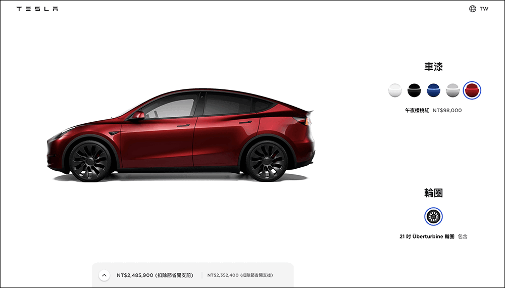即(7)日起,台灣特斯拉官網 Model Y 可選擇的車漆顏色共有五種,依序為免加價的「珍珠白(多塗層)」、選配價 3.75 萬元新台幣的「純黑」、選配價 4.8 萬元的「深藍」、選配價 9.38 萬元的「閃電銀」,以及選配價 9.8 萬元的「午夜櫻桃紅」。