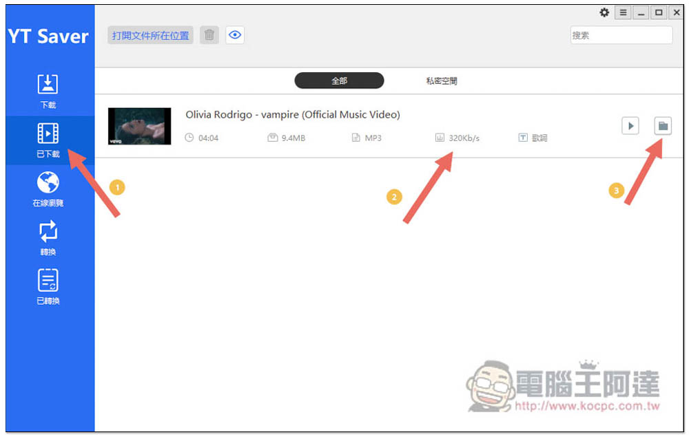 就會開始下載轉換,速度非常快,幾秒鐘就完成。完成後下方也會顯示相關資訊,包括格式、音質、檔案大小,按右邊的資料夾圖示可打開檔案所在位置: