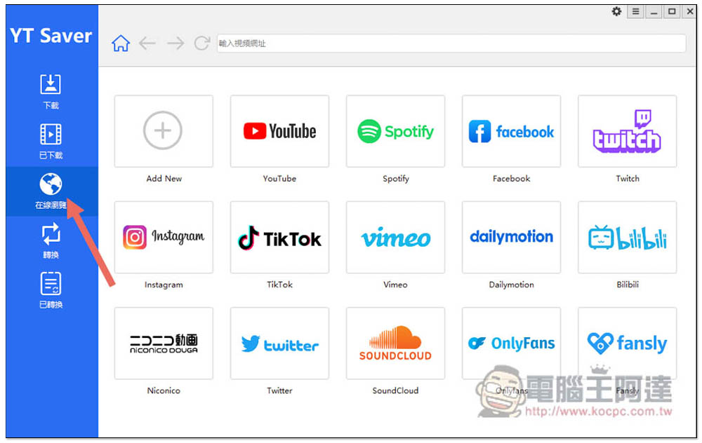 除了直接貼網址,這款也有內建瀏覽器功能,意味著你可以直接在裡面找要下載的影片或 MP3 音樂,畫面中列出的網站都能載,因此不只是 YouTube MP3 音樂,連 Spotify MP3、SoundCloud MP3 等熱門音樂網站都行,完全不怕找不到想要的音樂: