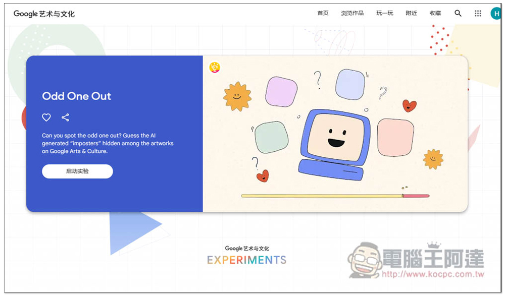Odd One Out 是 Google 藝術與文化中的小遊戲,目前還不支援中文,不過出現的 4 張圖片都是同類型,因此看不懂英文也沒關係,就直接圖片,點擊啟動實驗: