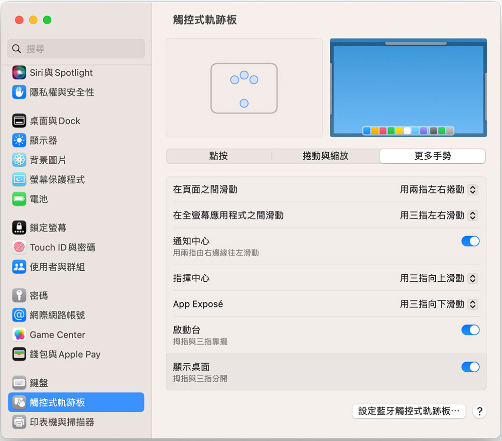 在「更多手勢」分頁裡,你將找到真正節省時間的使用方式。使用雙指輕掃在網頁瀏覽器中跳轉下一頁,使用三指或四指輕掃在不同的桌面空間之間跳轉,以及通過用三根或四根手指向上或向下輕掃來訪問指揮中心或 App Exposé。你甚至可以通過張開拇指和三根手指來快速顯示桌面。