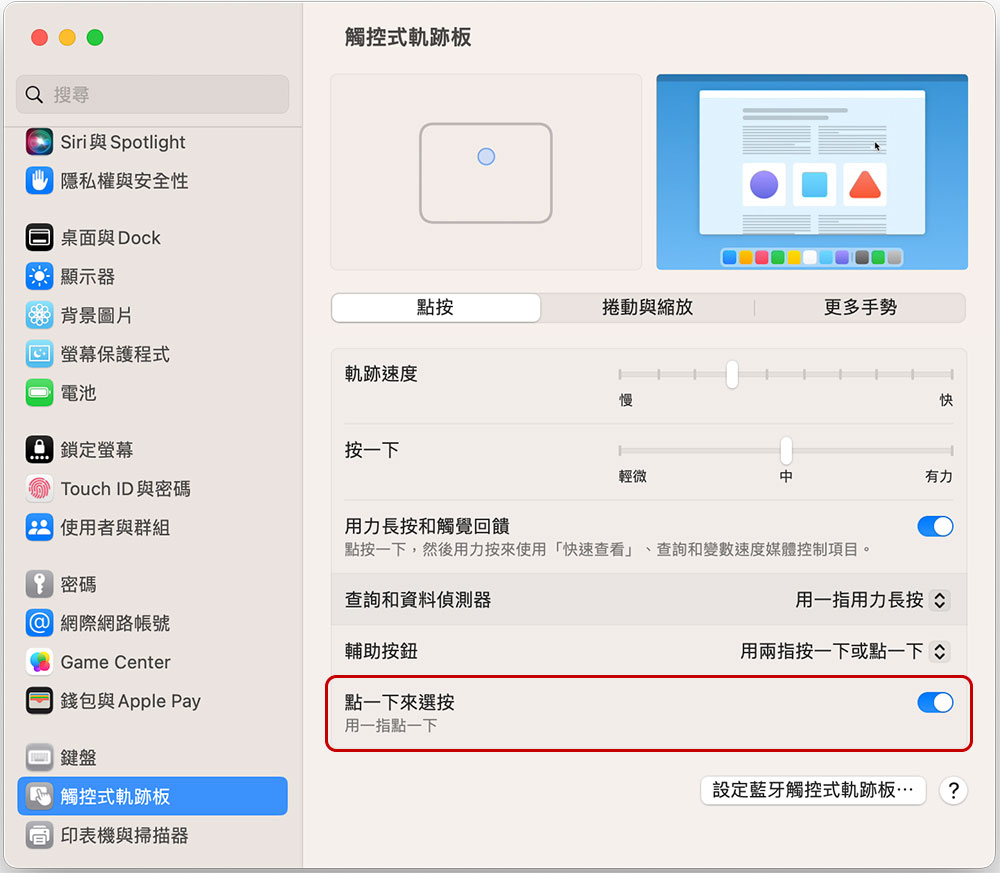 按右鍵呼叫功能表這點其實也不難。你可以用兩根手指在觸控板上點一下即可,如果覺得有點麻煩或操作起來不那麼順暢,當然你也可以按住 Control 鍵並點一下觸控板。若要使點按和連按更輕鬆,請在 macOS 觸控式軌跡板設定下啟用「點一下來選按」,啟用此功能後,你只需要在觸控板表面最輕的點擊(而不是點擊的全部力量或是按到有 Click 感)即可進行選擇。