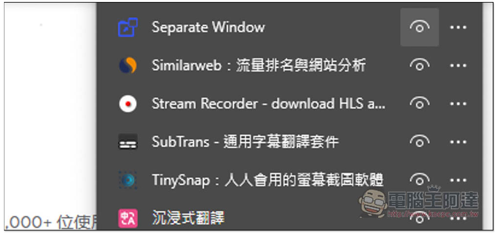 打開最右邊的拼圖圖示,找到這款擴充功能後,把右邊眼睛打開就完成了: