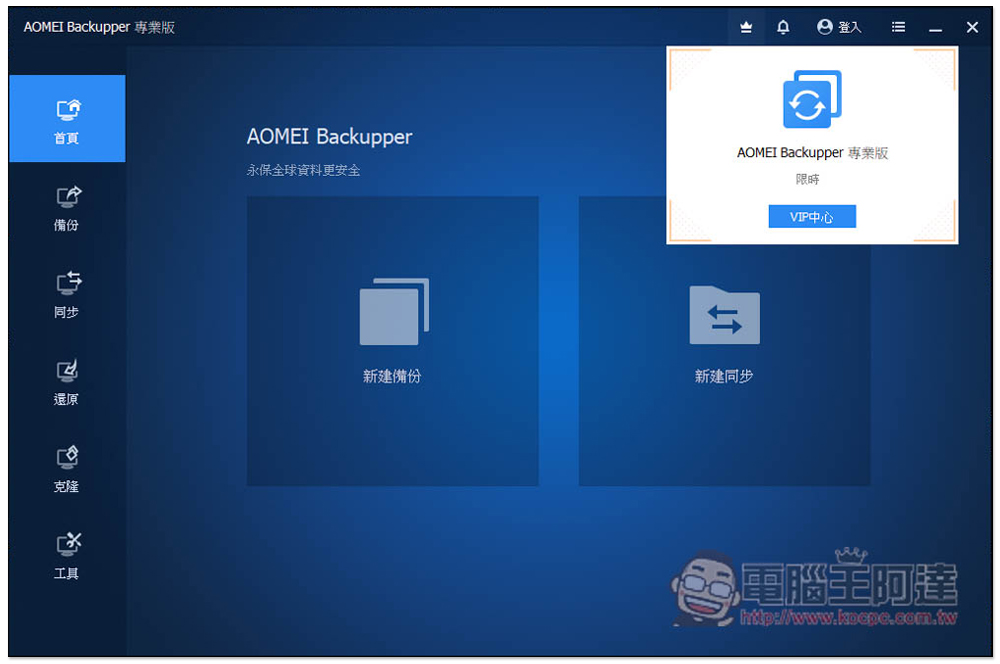 原本的試用版字樣也會消失,變成 AOMEI Backupper 專業版,右上方也會註明是限時免費版本,不過沒有寫到什麼時候,基本上就是免費一年: