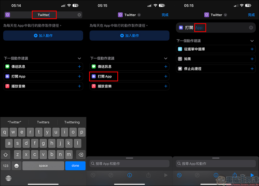 這時可將捷徑名稱更換為 Twitter ,再到下面執行的動作選擇「打開 App」。接下來,點選打開「App」選擇想讓這捷徑執行的 App: