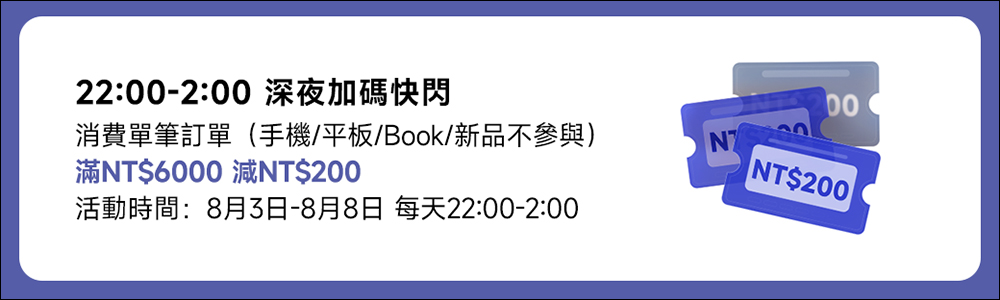 自 8 月 3 日至 8 月 8 日期間,每天 22:00~02:0 還有「深夜加碼快閃」優惠!於上述期間消費單筆訂單滿 NT$6,000 ,立即折 NT$200!