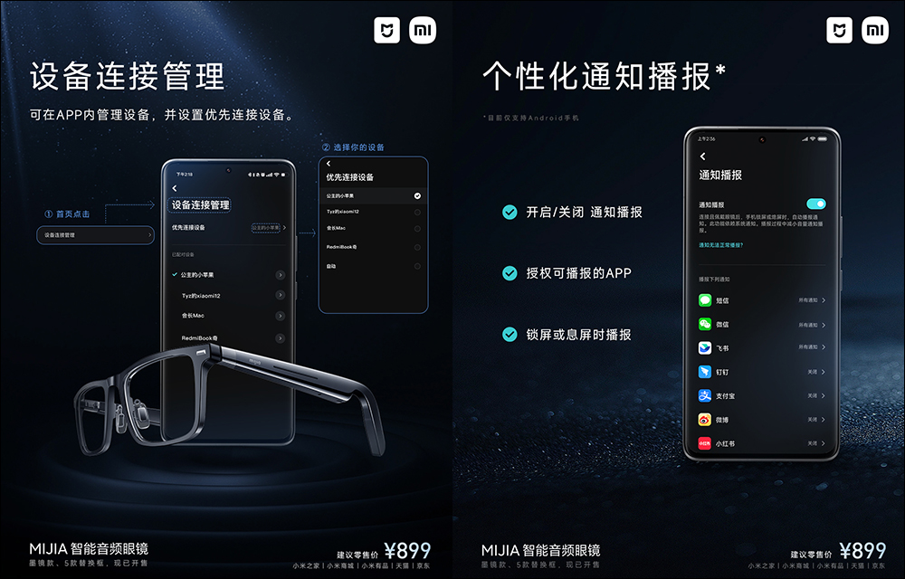 在 OTA 升級後,米家智慧音頻眼鏡可在 App 內管理連接設備,亦可通過個性化通知,選擇要推播通知的 App ,以獲得更好的使用體驗。