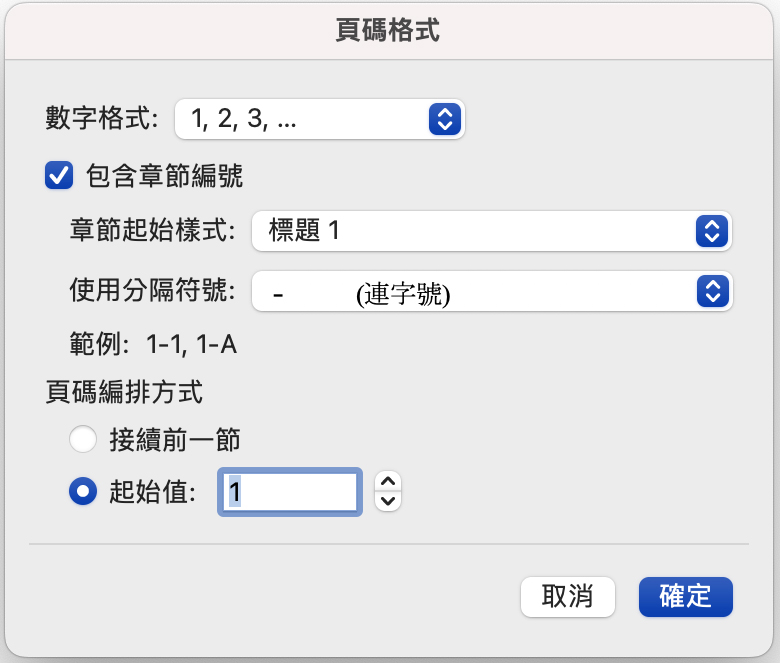 - 你還可以點擊「頁碼格式」改變頁碼的形式外觀,包含數字格式、章節編號、分隔符號與編排方式等。