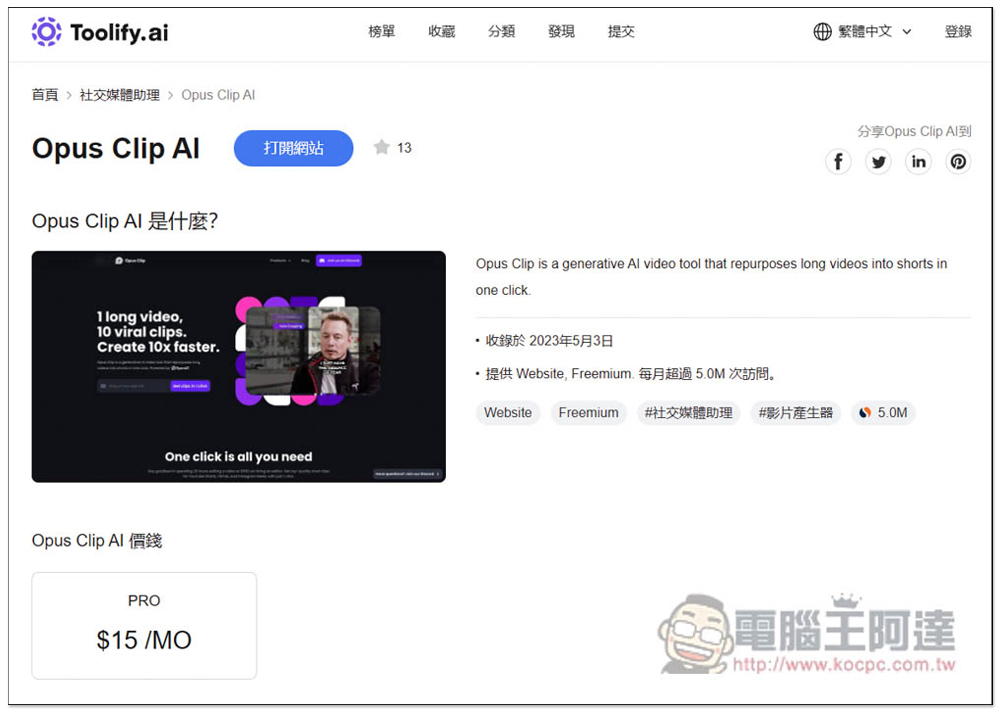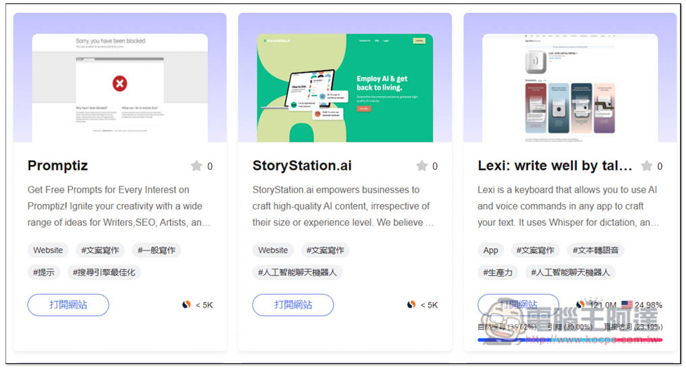 進入任一 AI 工具介紹頁面後,點擊打開網站,就能進到該 AI 工具的官網,另外這頁面還有一些不錯的介紹和數據: