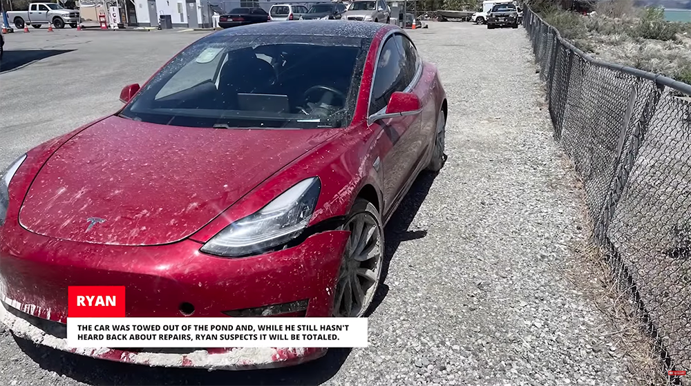 然後只能說只有積水也就算了,偏偏旁邊就是個水深及…「特斯拉半個車身高」的水塘。還好死不死,道路與水塘之間還有一堆石塊擋著。所以原本可能還有機會順順開進水裡的失控電動車,就這樣歷經了一個小跳台飛起後直接衝進水中拋錨…