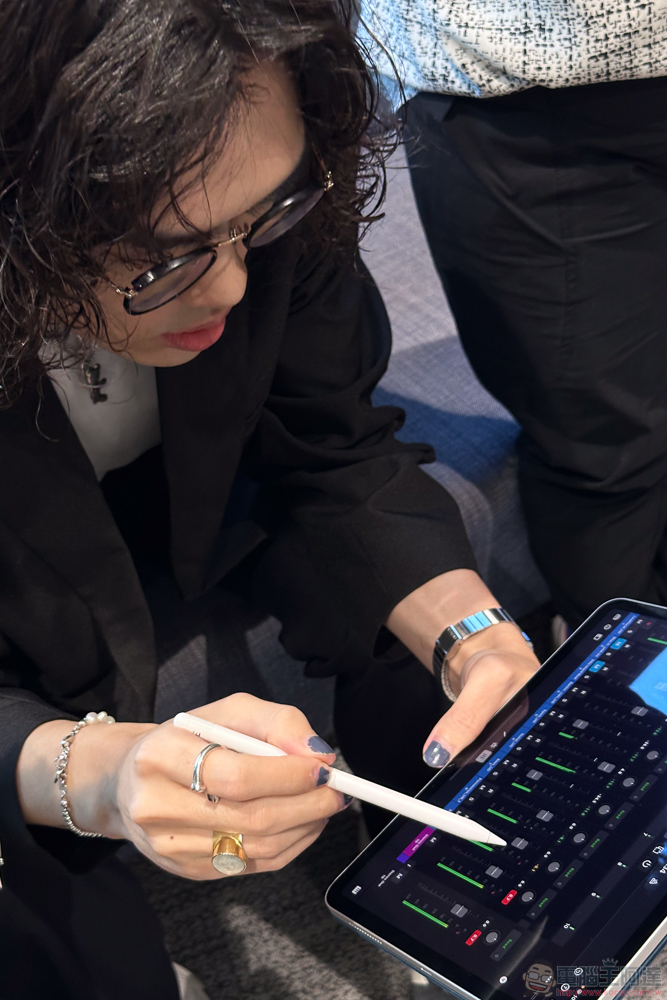 手拿著 iPad Pro 直接向媒體們示範他用 iPad 版 Logic Pro 尋覓創作靈感的鶴The Crane。真的給人一種在「玩音樂」的感覺!他提到自己雖然以往也會透過像是 iPhone 這樣的行動裝置來進行創作。不過都還是偏向於快速紀錄創作靈感的簡單錄音或寫詞的使用為主。認為真的要獨立使用可能還是偏辛苦了點。
