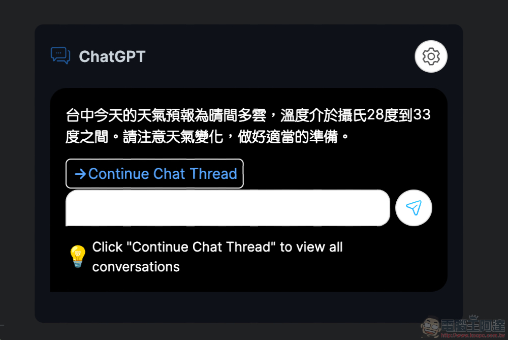 你可以在右側的聊天視窗欄繼續與 ChatGPT 談話詢問問題。也可以透過「Continue Chat Thread」來在網頁版 ChatGPT 繼續談話: