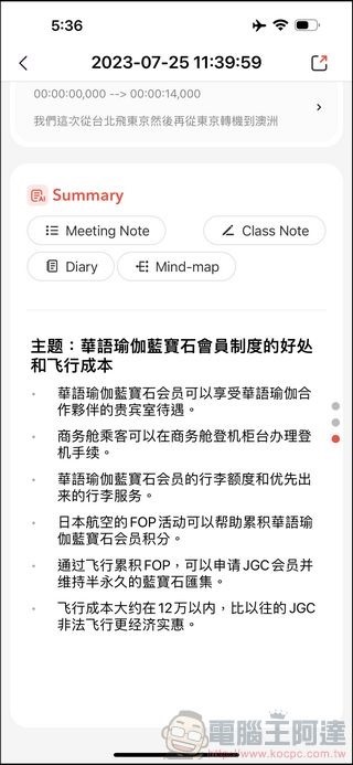在逐字檔下方會有透過 ChatGPT 彙整的內容,共有重點摘要、會議總結、心智圖、課堂精華等功能,不過目前 App 的版本僅有重點摘要有中文,其他功能就算內容是中文也會以英文呈現。另外由於中文同音字很多,如果在逐字檔處理就有名詞辨識錯誤的話,那麼總結的內容也會是錯誤的(廠商表示會加入修改辨識錯字的功能):