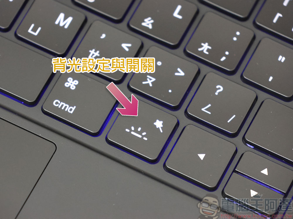 鍵盤部分,採用 1.5mm 鍵程的金屬鍵芯的剪刀腳結構,既安靜、耐用同時兼顧手感,更可均勻受力精準捕捉每一次敲擊。這次在鍵帽上特別為台灣市場加了注音印刷,讓你打字輸入更輕鬆。最上排數字鍵結合功能鍵,想要控制多媒體、亮度等功能直接操作。