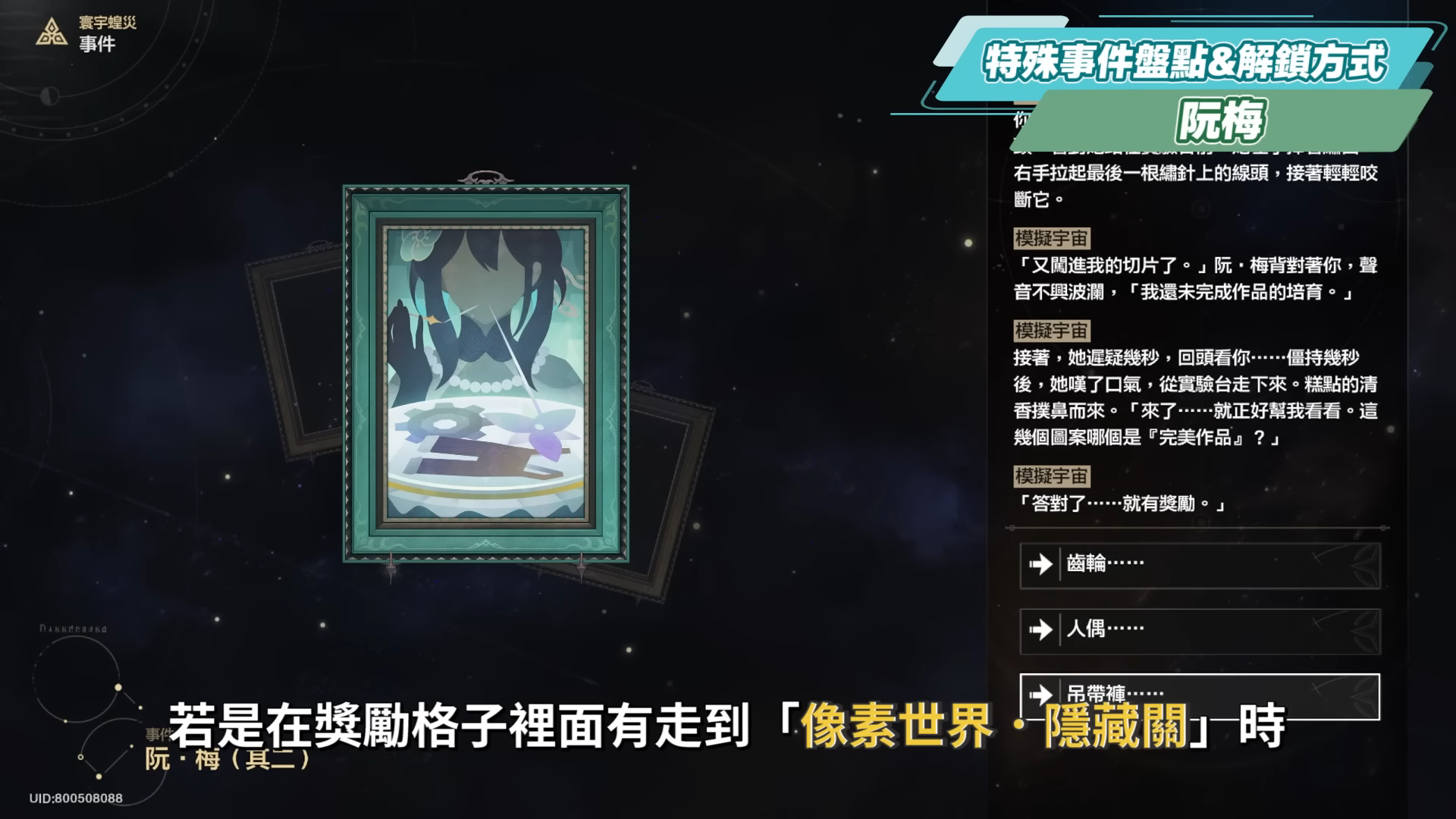 如果不是歐洲人的話,阮梅應該可以說是全部事件裡面最難刷的了,而且還有兩篇,只是想要吃阮飯是多麼的不容易啊~阮梅事件的選項都非常的OP,不過若是遇到的時機點不對的話其實也發揮不了多大作用,因此最後都是拿來開圖鑑用。阮梅的事件一樣是用記憶命途瘋狂複製獎勵格子來刷,若是在獎勵格子裡面有走到「像素世界.隱藏關」時,也可以都拿作弊,一直選複製格子來想辦法遇到阮梅,沒有任何的技巧,就是靠運氣來吃阮飯,拿完其二之後,洛洛也終於完成全圖鑑解鎖了。