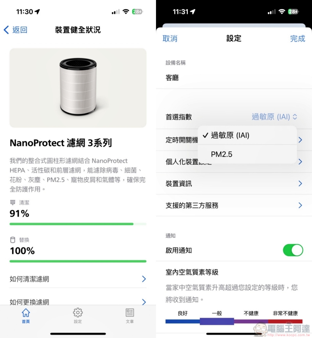 若是濾網需要清潔或更換,App 裡也可以查看濾網狀況。