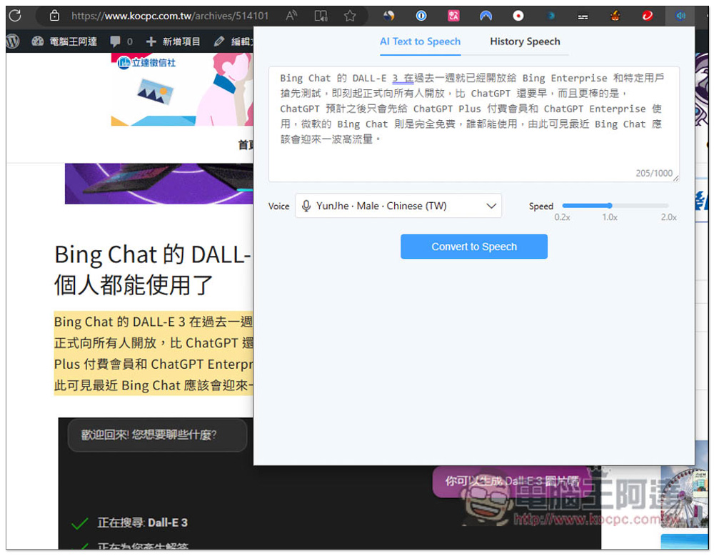然後就把你要轉成 AI 語音的文字輸入進來,最多 1000 字,超過的話就再重新轉換一個新的,隨後再透過後製軟體組合起來就好。按下方 Convert to Speedch 就會開始轉換: