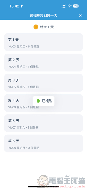 行程順序你可以讓 AI 幫你排,也可以自行排序(PS:但我在旅程第一天選擇機場,卻會幫我排到最後一個行程有點小怪 XD 這應該之後會調整吧),然後我蠻喜歡單一行程選擇「複製」時,可以直接針對每一天快速貼入同個行程 – 你如果連續住同個飯店,光一直重複搜尋把飯店加入每天的頭尾就夠你受了(但還是會希望能提供一開始就輸入住宿地點的選項就是了):