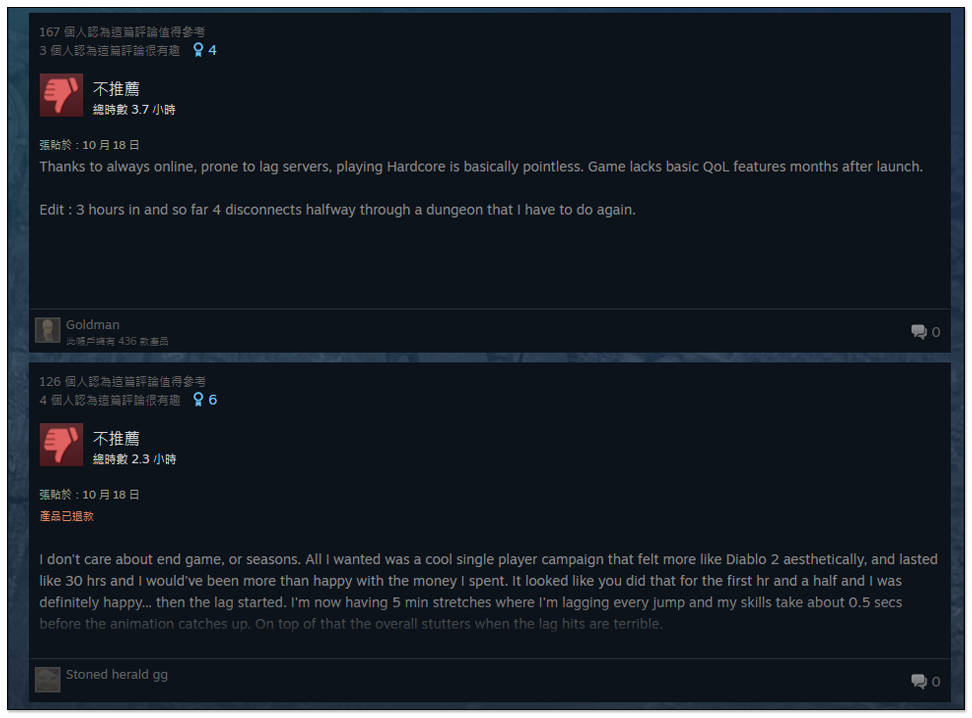 還有一位是 D1 一直玩到 D4 的玩家:「到了D4我還是第一批預購玩家,但是我感覺自己就是純純的大怨種。我給差評是因為沒有人能逃過平衡組不動腦子說砍就砍的大刀,感覺像是在玩寸止,哪個職業開始嗨了就得挨一刀,砍平衡效率比修bug還高。」