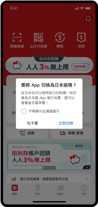 首先當你在日本開啟街口支付後,系統會跳出提示問要不要切換到日本,要選立即切換: