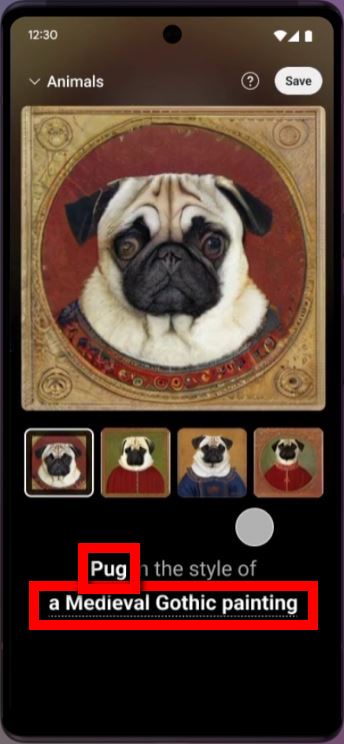製作自己獨特的播放清單封面還可以用隨機的方式製作,以官方給的影片為例,AI一次會隨機生成五張圖像,而這五張圖像的風格可以由我們來選擇。譬如本來是”Pop Art Painting”風格的”哈巴狗”可以選擇改變為”Medieval Gothic painting”的”哈巴狗”。製作出喜歡的圖像後點擊儲存後,AI生成的圖像就會變成你的播放清單的圖像。