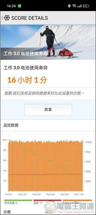 OPPO Find N3 搭載 4680mAh 容量電池,以 PCMARK 進行續航測試,折疊狀態下由 100% 持續進行壓力測試,到20%時共堅持了 16小時: