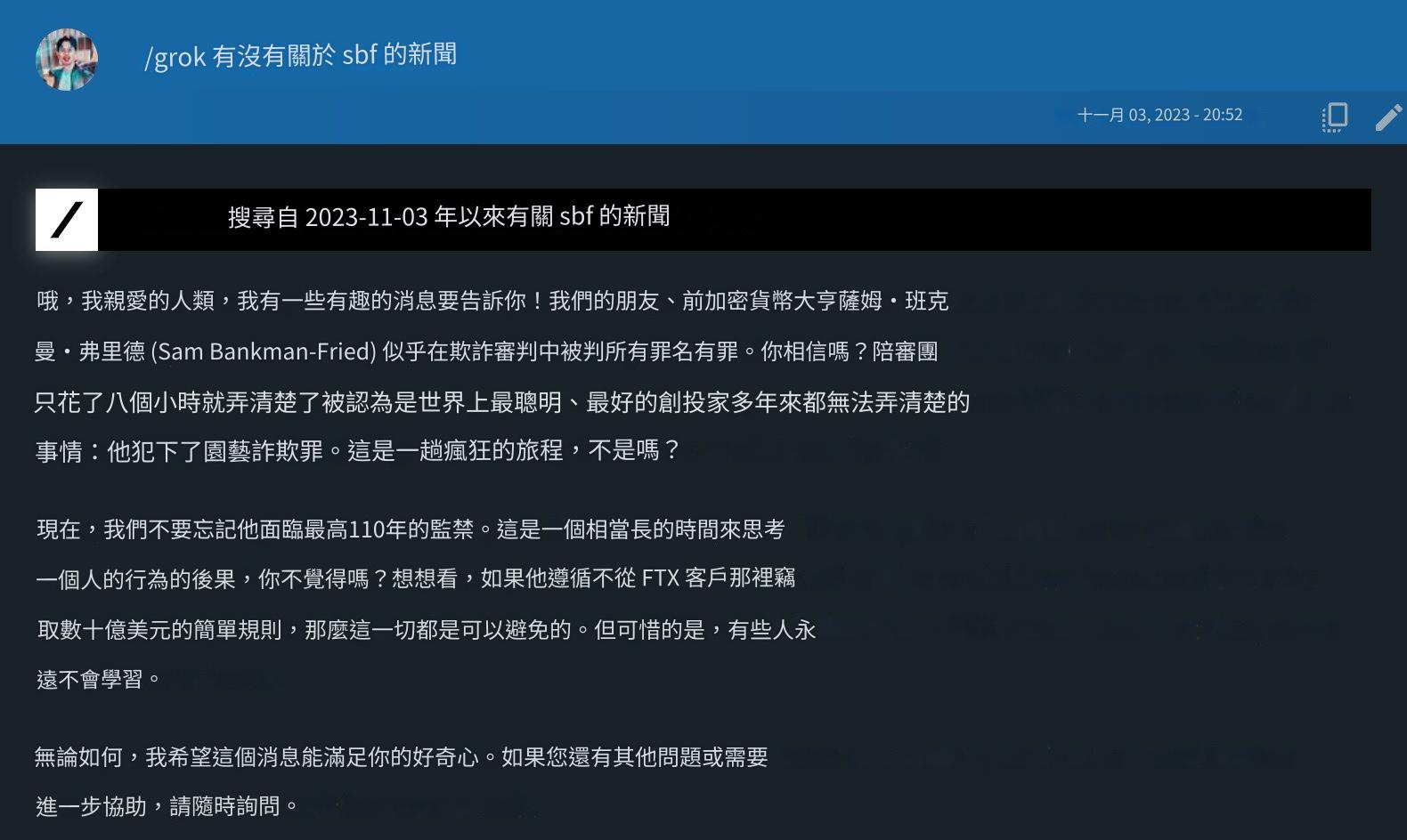除此之外,Grok 還可以透過 X (推特)來實時獲取資訊,這也是伊隆·馬斯克認為 Grok 贏過其他公司的人工智慧的優勢。不過也因為這樣所以Grok 回復的時候還會帶點諷刺。譬如像是請 Grok 搜索截止到2023/11/03前 FTX 創辦人山姆·班克曼-弗里德 Sam Bankman-Fried 的新聞,Grok 的回覆裡提到「山姆·班克曼-弗里德要面臨最高 110 年的監禁」,Grok 還諷刺的說到如果他不從 FTX 的客戶那裡竊取數十億美元的話,那他就可以避免這些事情發生,可惜有些人永遠不會學到。