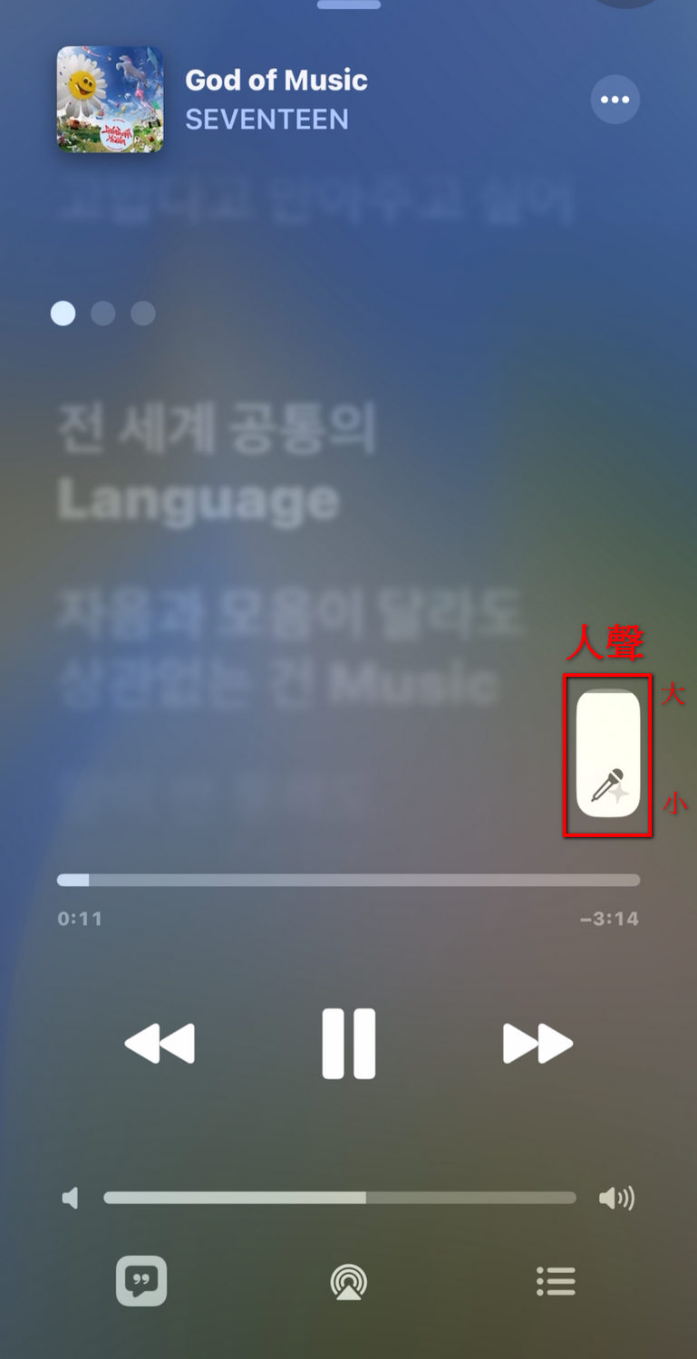 畫面會出現你聽的歌曲的歌詞,歌曲進度條的上方會有一個「麥克風」的圖案。這個麥克風可以調整歌手的聲音,讓你不管在哪裡都有在 KTV 唱歌的感覺。