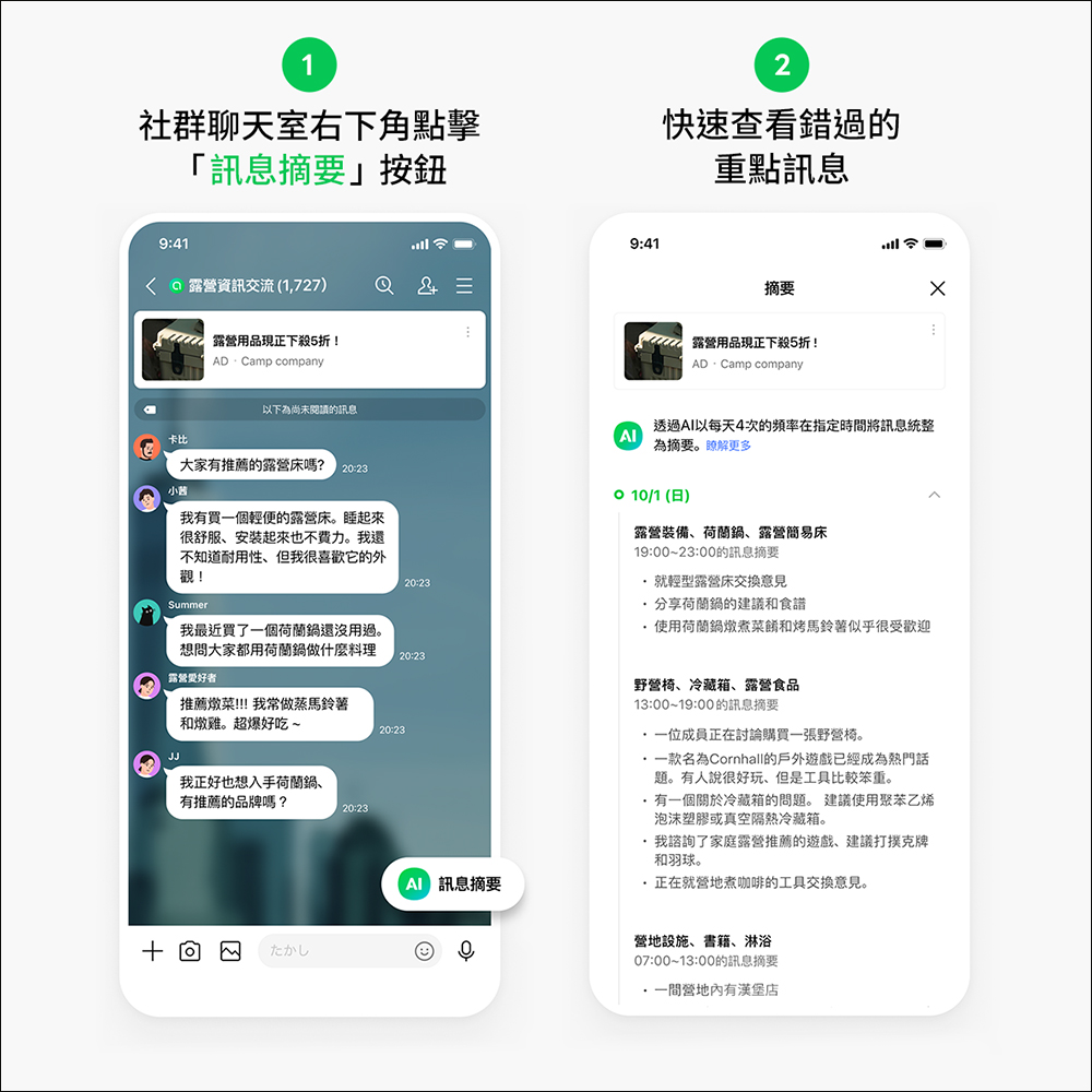 LINE 社群成員擁有數千人,擔心工作忙碌後,打開社群就有讀不完的訊息、從此跟不上社群的話題嗎?最近,LINE 社群「訊息摘要」新功能上線囉!透過 AI 幫用戶總結 LINE 社群聊天室訊息、自動在特定時間進行摘要,讓大家不錯過聊天室的討論話題,這功能將陸續在 LINE 社群開放。