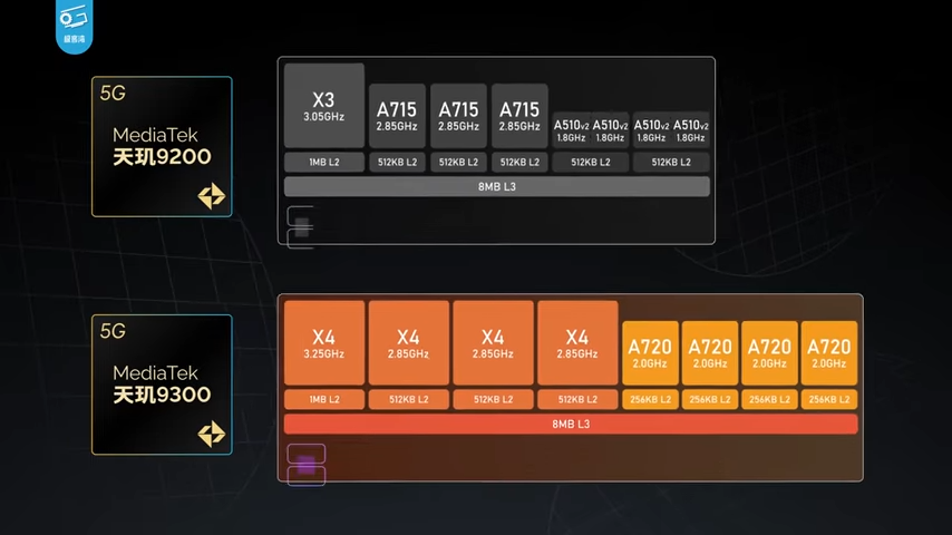 聯發科天璣 9300 採用台積電第三代 4nm 製程工藝,總共有 8 個核心,由 4 個 Cortex-X4 和 4 個 Cortex-A720 組成,Cortex-X4 部分有 1 個核心來到 3.25GHz,另外 3 個為 2.85GHz,Coretex-A720 都是 2.0GHz,GPU 方面搭載 Immortails-G720,更詳細的聯發科天璣 9300 的規格和介紹,可以點我閱讀這篇報導:
