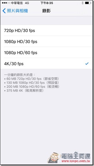 iPhone 6s Plus實際使用時,錄影模式預設還是1080P,想要使用4K錄影的話,您必須先到設定內自己做調整,開啟選項之後才能進行 4K 錄影。要提醒的是,只有一般錄影模式可以使用4K錄影,而且切換4K錄影時,畫面右下角會有一個4K的標誌提醒你: