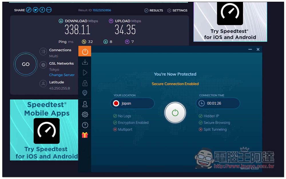 Ivacy 的連線速度也還算不錯,雖然在 VPN 業界中不是說非常快,但是有平均水準之上,特別是連同個國家。我目前人在日本,我使用 WireGuard 協定,連線日本伺服器後,測得下載速度高達 338.11Mbps,上傳也有 34.35Mbps,因此上網可說相當順: