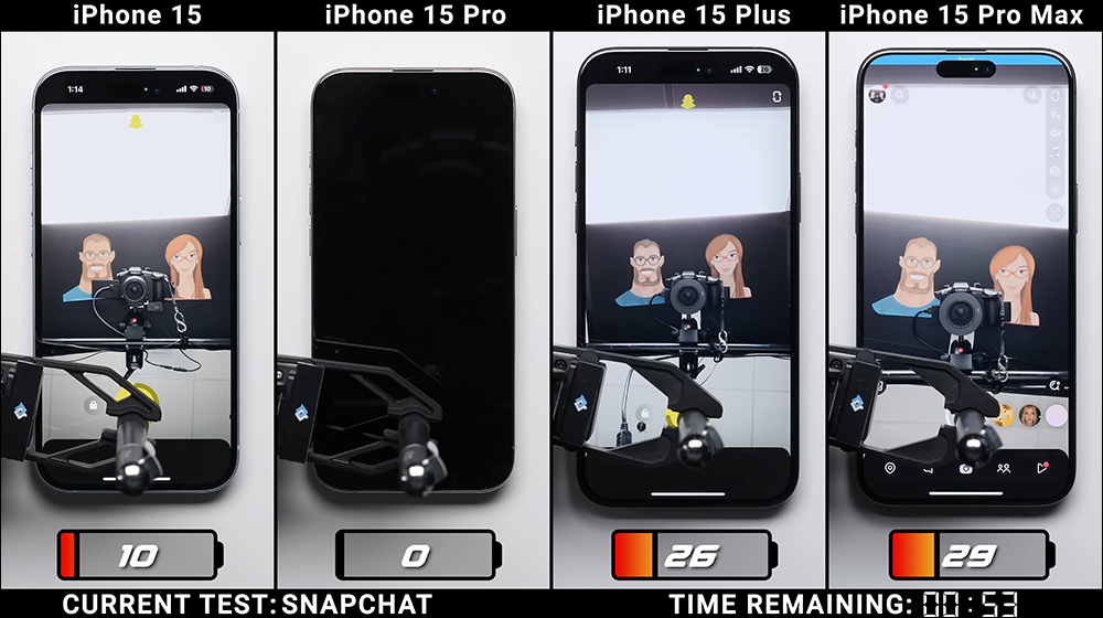 接著測試 SnapChat 執行 1 小時,但 iPhone 15 Pro 在測試還有 53 分鐘時就將電量耗盡。
